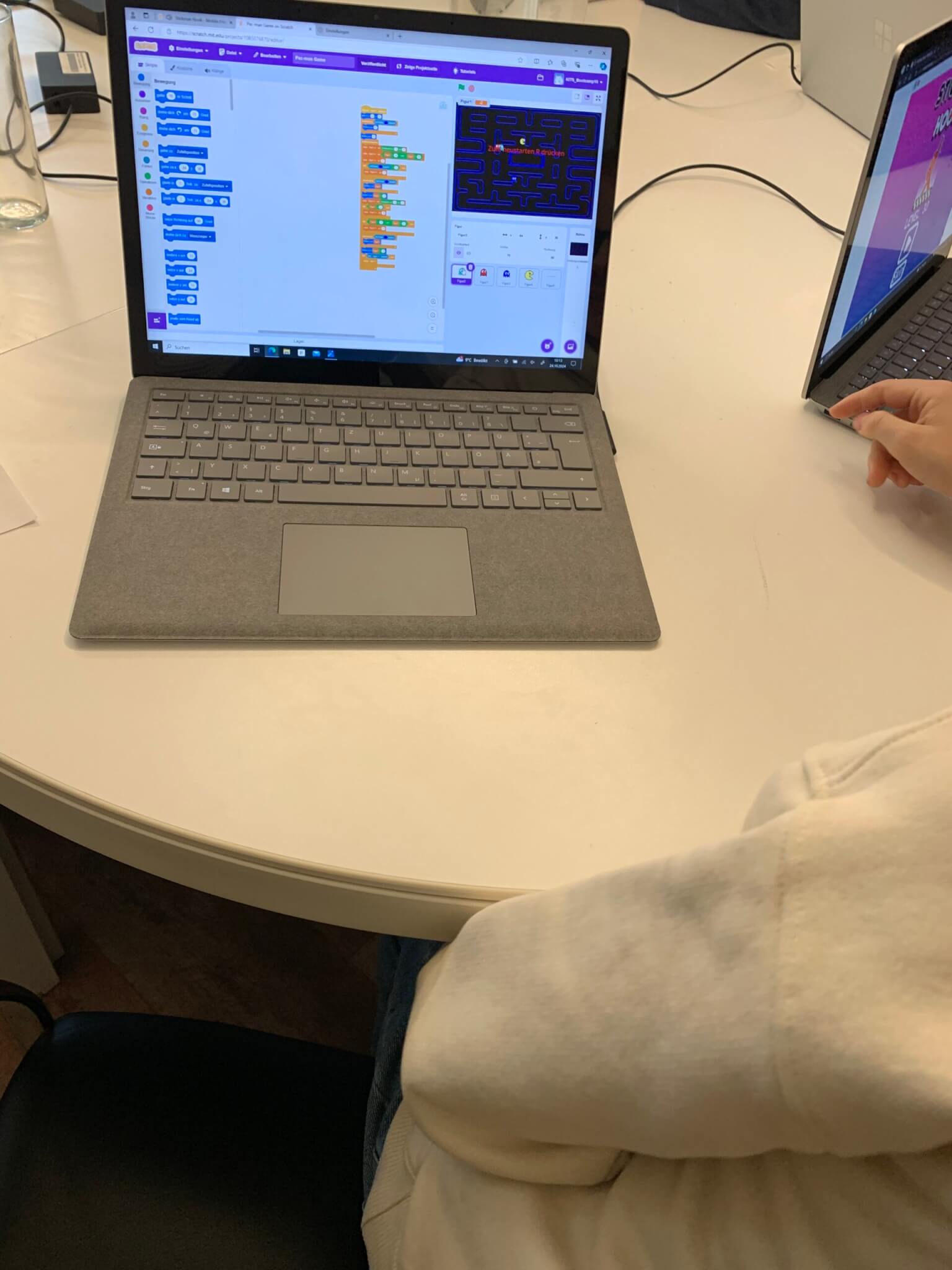 Am zweiten Tag lernten die Teilnehmer dann den Umgang mit der Programmiersprache „Scratch“ und konnten mit Hilfe dieser blockbasierten Programmiersprache bereits nach kurzer Zeit eigene Programme erstellen. Es entstanden spannende Ideen für eigene Projekte, wie ein Pac-Man-ähnliches Spiel, ein virtuelles Fußballspiel und Quiz-Spiele. Die Freude war groß, als die Kinder ihre selbst erstellten Spielfiguren über die Bildschirme steuern konnten.
