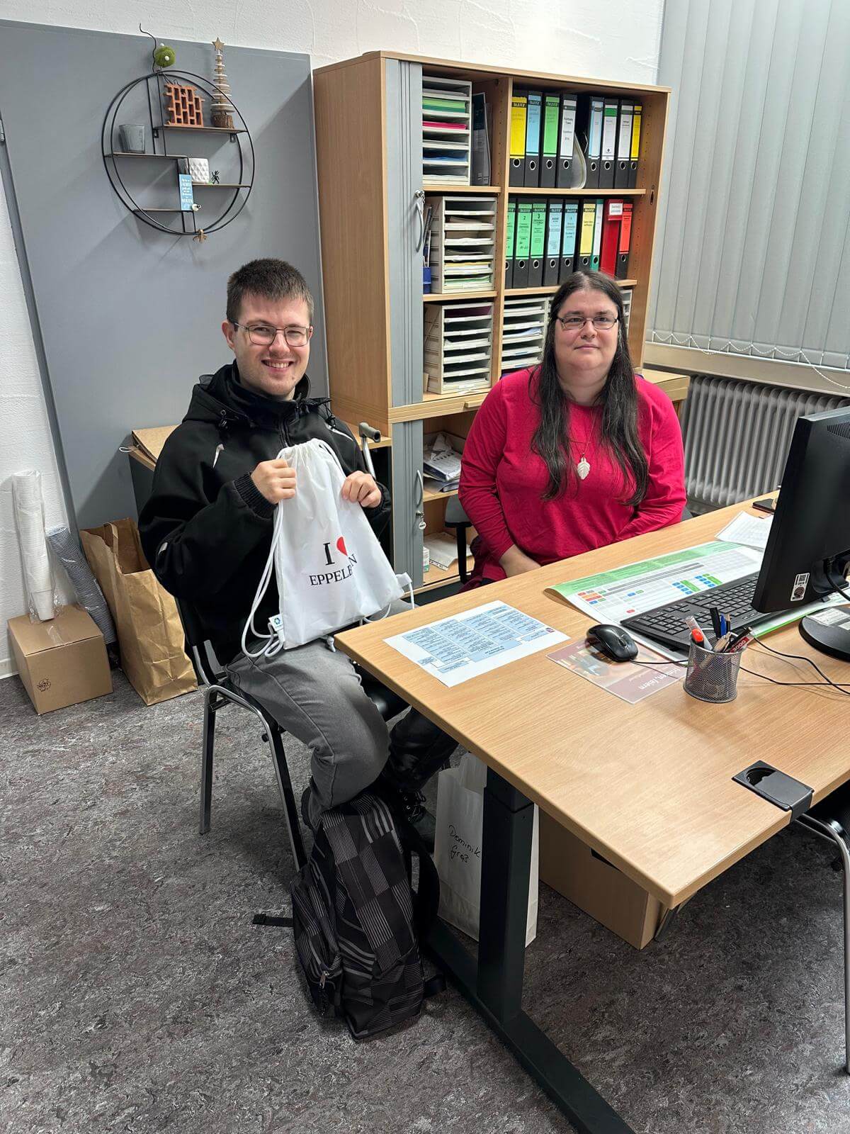 Am 25. September war es bereits zum zweiten Mal so weit: Ein Mitarbeiter einer Behindertenwerkstatt, in diesem Fall die Reha-GmbH, besuchte das Eppelborner Rathaus, um einen Eindruck vom dortigen Arbeitsalltag zu gewinnen. Dominik Groß vom Logistikcenter der Reha-GmbH in Lebach und Melanie Schmitt, Mitarbeiterin der Bürgerinformation der Gemeindeverwaltung, tauschten sich aus. Frau Schmitt erklärte dem interessierten 27-Jährigen die verschiedenen Fachbereiche des Rathauses und brachte ihm einige Fakten über die Gemeinde Eppelborn näher. Von den Aufgaben der unterschiedlichen Abteilungen im Rathaus über Städtepartnerschaften bis hin zu touristischen Angeboten in unserer Heimatgemeinde war vieles Thema. Dominik Groß war dabei, wenn Ratsuchende die Bürgerinfo besuchten und stellte einige Fragen. Umgekehrt erfuhr Melanie Schmitt etwas über die Aufgaben des jungen Mannes in der Reha-GmbH und die Abläufe dort. Die Mittagspause verbrachten die beiden ebenfalls gemeinsam, zusammen mit anderen Kollegen der Gemeindeverwaltung. Anschließend zeigte die stellvertretende Leiterin des Fachbereiches Bürgerdienste, Frau Maria Fuchs, Dominik Groß das Rathaus bei einer kurzen Führung. Als kleine Erinnerung gabs für Herrn Groß auch noch eine Tasche mit Gemeinde Eppelborn-Goodies.
