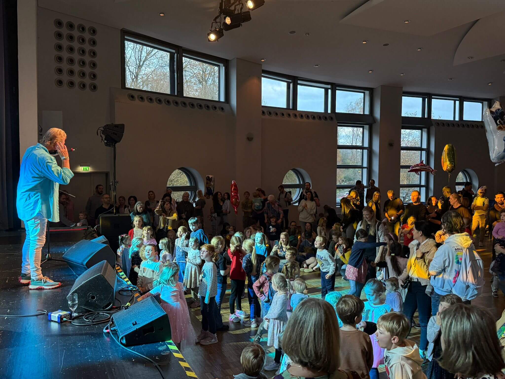 Schon zu Beginn riss Volker Rosin die Kinder mit seiner mitreißenden Art mit. In seiner Show wurde gesungen, getanzt, gehüpft und geklatscht – immer mit absolutem Mitmach-Faktor. Mit seinen Hits wie „Die Kuh Mathilde“, „Baby Hai“ oder „Mama Laudaaa“ brachte er die Bühne zum Beben. Natürlich durften auch die Klassiker wie „Der Gorilla mit der Sonnenbrille“, „Das singende Känguru“ und „Das Lied über mich“  nicht fehlen und wurden lautstark mitgesungen – nicht nur von den Kindern, sondern auch von vielen Eltern, die selbst mit diesen Liedern aufgewachsen sind.