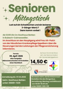 Der Seniorenbeirat hat noch eine zweite Aktion auf den Weg gebracht. Von dieser werden wir in Kürze bericten und sie den Bürgern und Bürgerinnen der Gemeinde Eppelborn vorstellen.