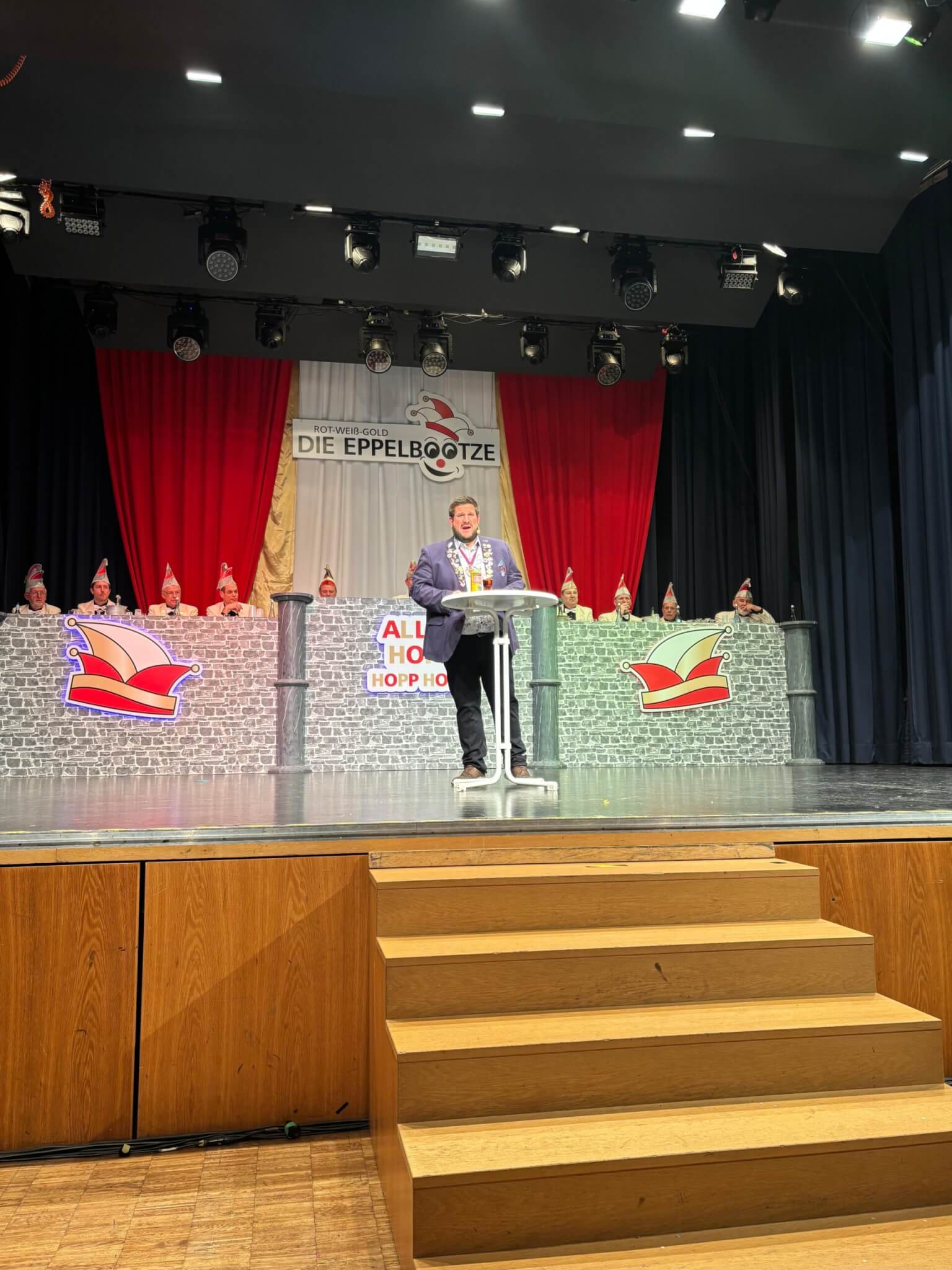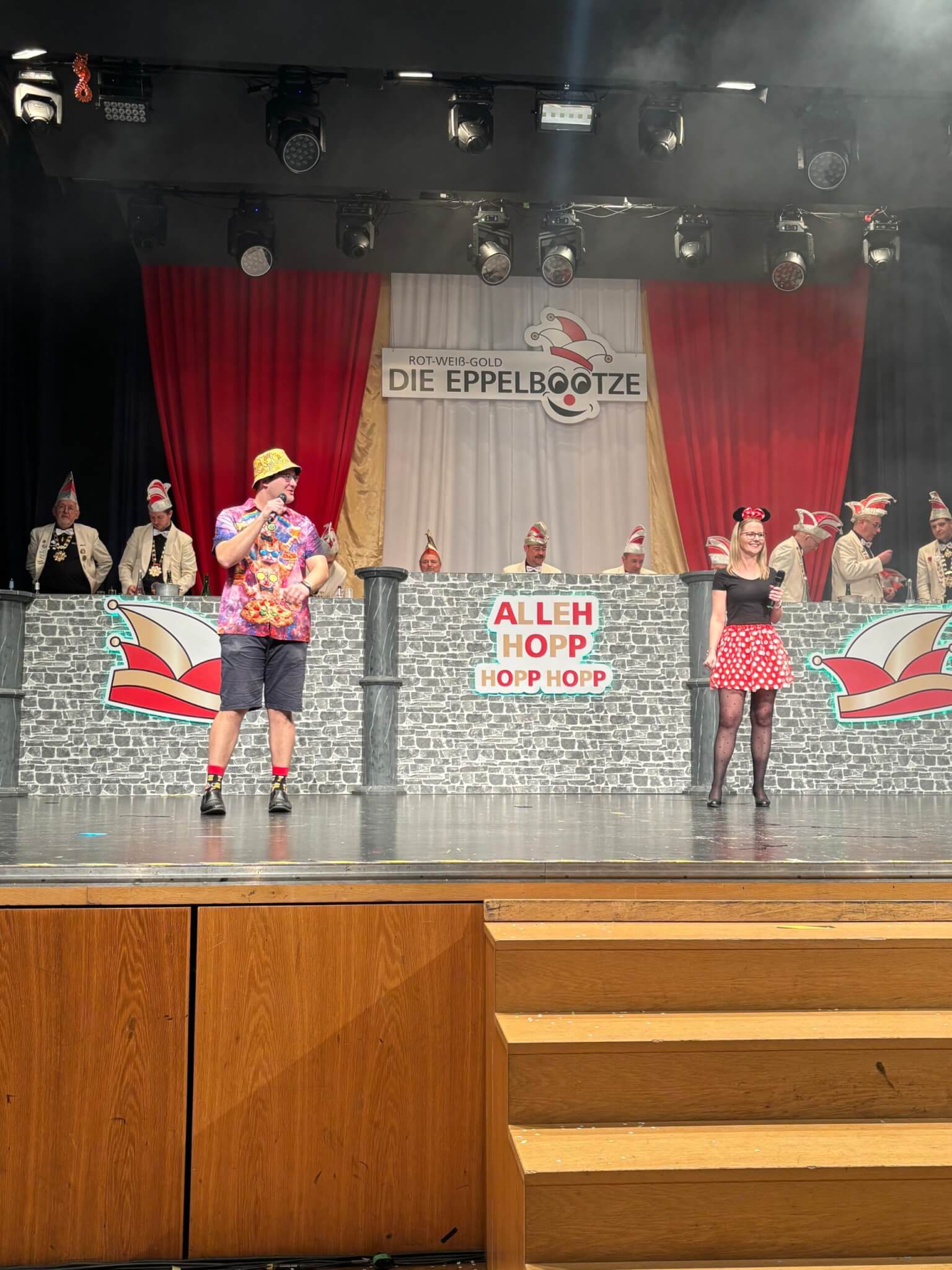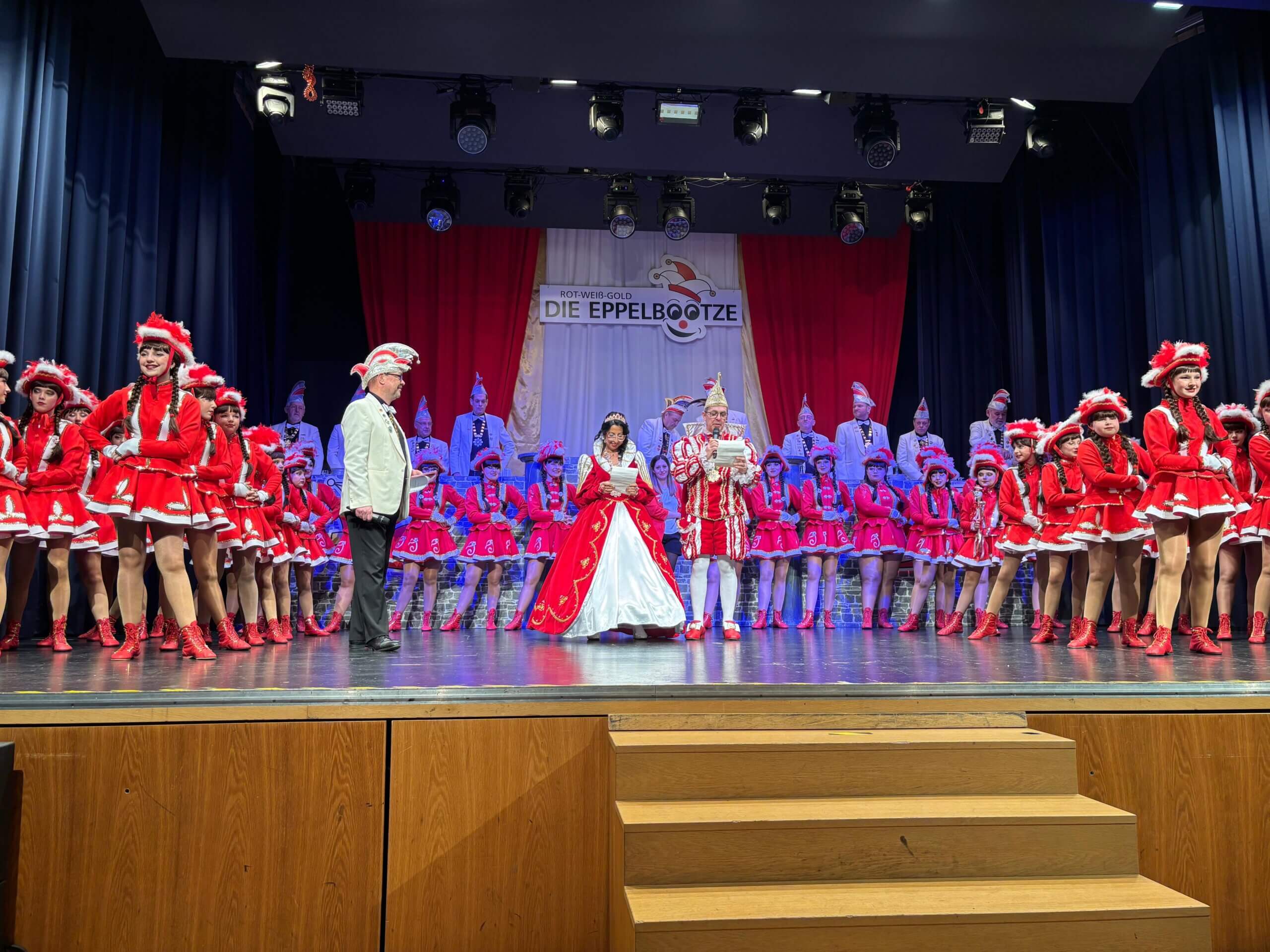 Mit einer rundum gelungenen Prunkkappensitzung ist der Karnevalsverein ROT-WEISS-GOLD „Die Eppelbootze“ am vergangenen Samstag in die heiße Phase der Session gestartet. Elferratspräsident Jörg Olliger begrüßte die Narren im Saal pünktlich um 19:11 Uhr und übergab anschließend das Zepter an Nicole Florek und Nikolaus Hesedenz, die mit ihrer unverwechselbaren, humorvollen Art souverän und unterhaltsam durch das Programm führten. Das Prinzenpaar der Eppelbootze, Prinzessin Maria-Francesca I. und Prinz Michael I., begrüßten mit Ihrer Rede ihrerseits das Eppelborner Publikum.