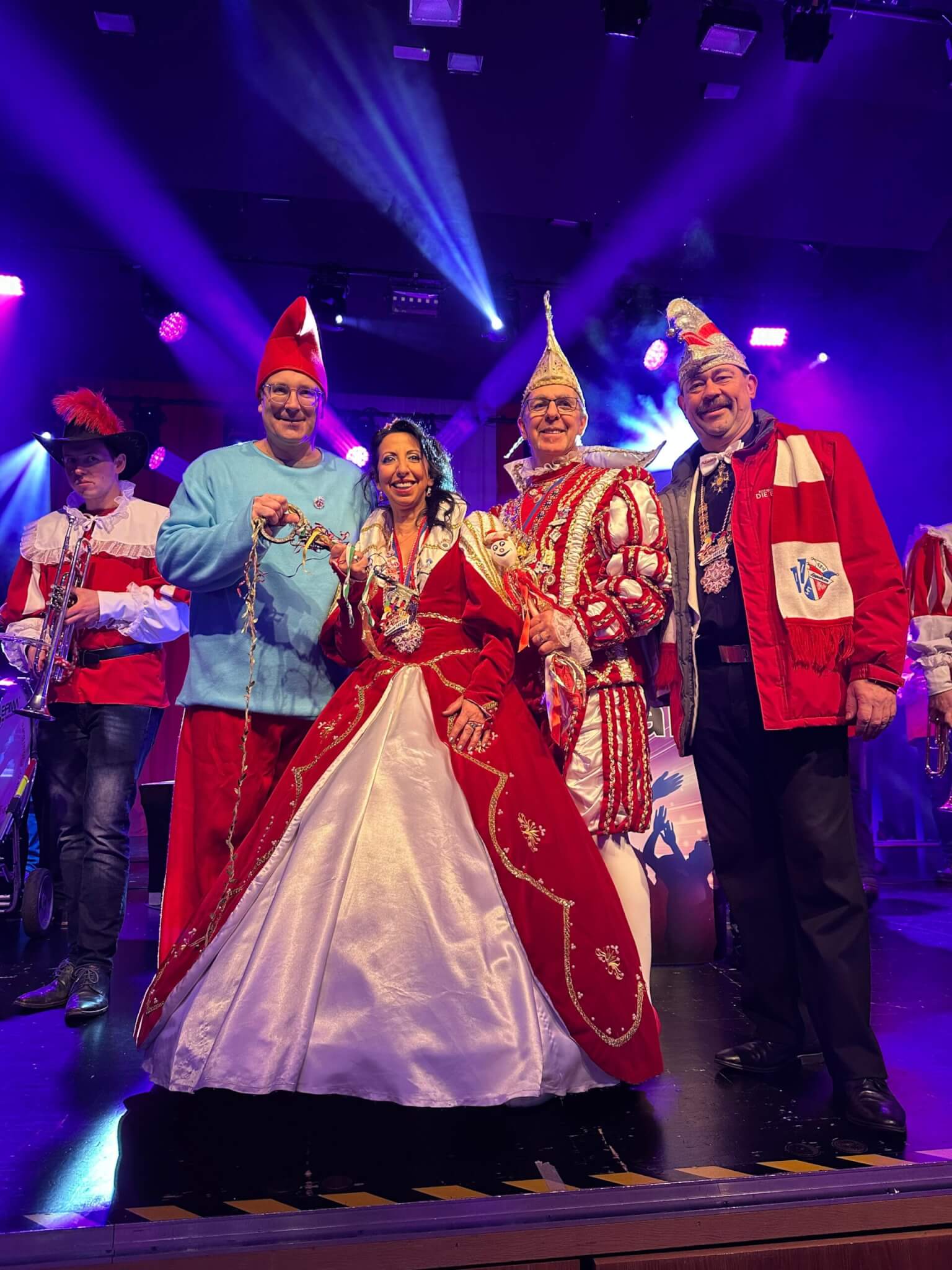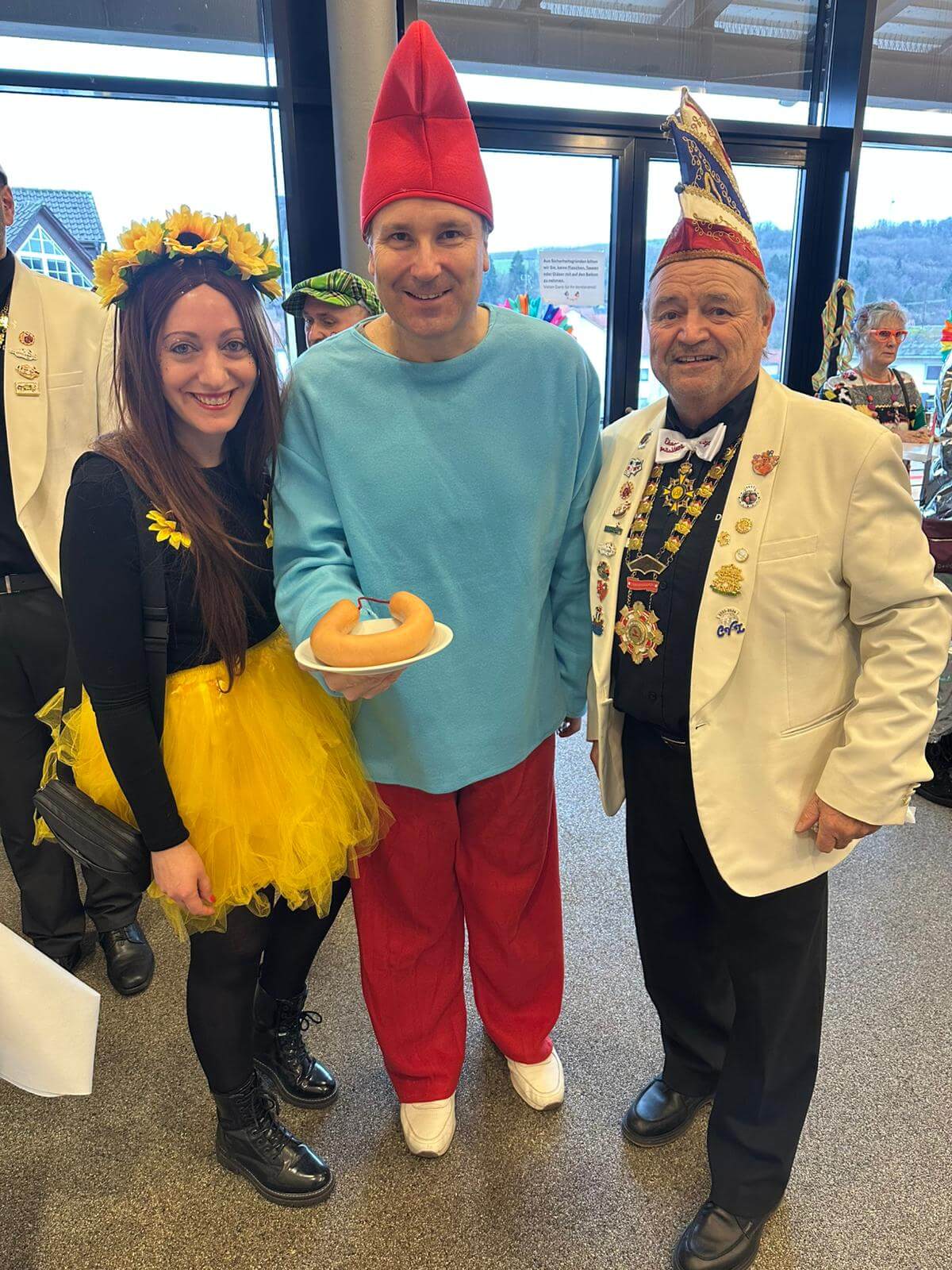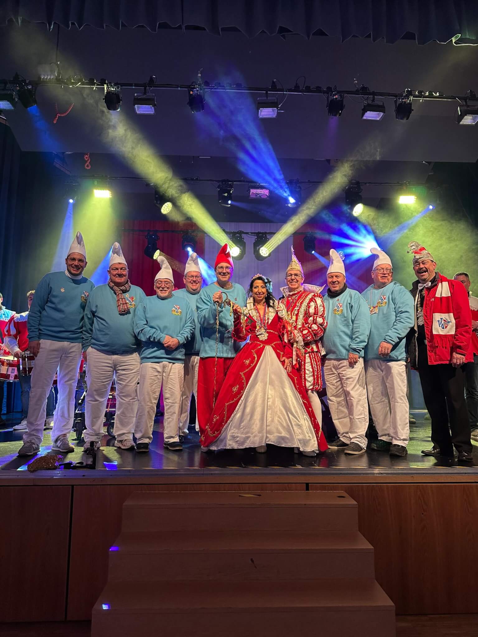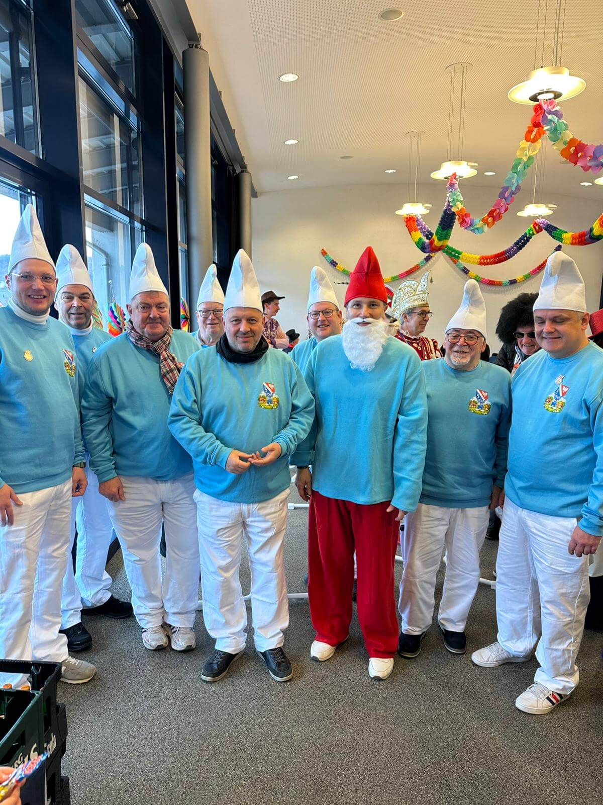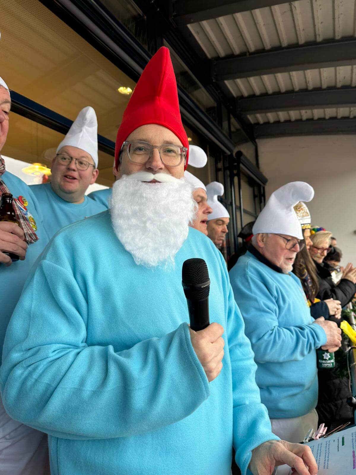 Mit gereimten Versen und großem Selbstbewusstsein verteidigte Papa Schlumpf sein „Schlumpfhausen“ gegen den lautstarken Ansturm. Doch die Karnevalisten ließen sich nicht beirren. In einem wortgewandten Schlagabtausch mit den Vereinsvertretern und dem Prinzenpaar mussten sie zunächst zwei Prüfungen meistern: Tanzen und Reimen waren gefragt – Aufgaben, die die Narrenschar mit Bravour bestand.