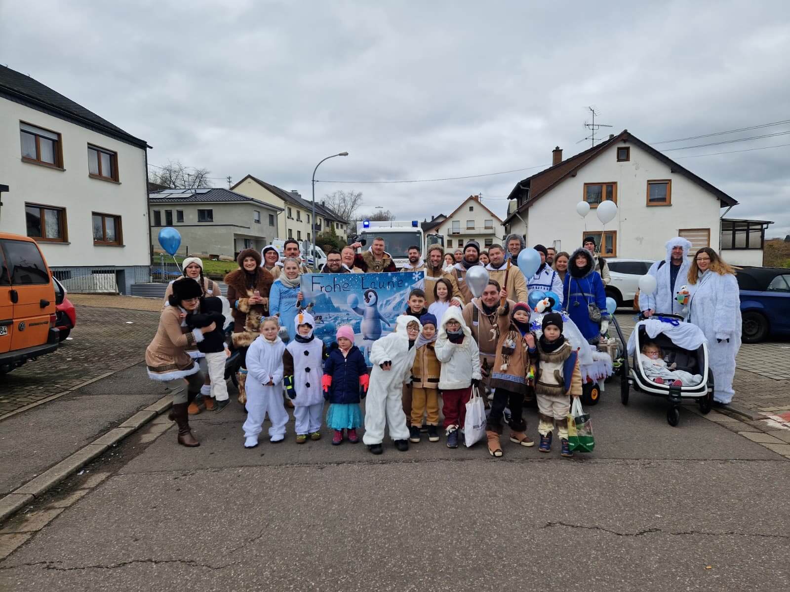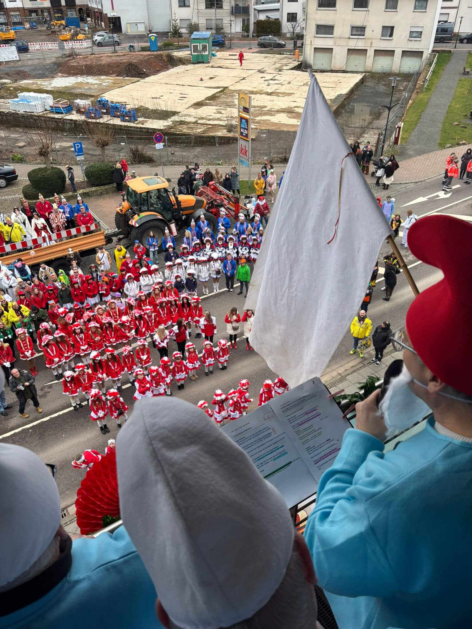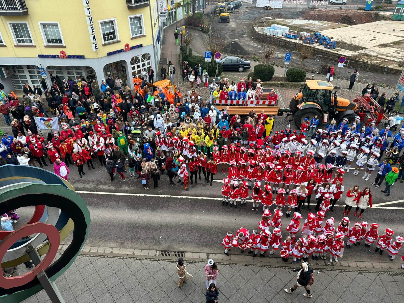 Vor dem big Eppel bot sich ein beeindruckendes Bild: Hunderte Karnevalisten, allen voran die „Rot-Weiß-Gold die Eppelbootze“, verwandelten den Platz in ein Meer aus Rot, Weiß, Gold und Blau. Mit dabei waren Abordnungen des Humeser Karnevalsvereins, des Habacher Karnevalsvereins, des Kolping Karnevalsvereins Dirmingen, der Wilden Elf Wiesbach sowie das Lebacher Prinzenpaar. Unterstützt wurden sie musikalisch vom Eppelborner Fanfarenzug und dem Instrumentalverein Eppelborn, die trotz niedrigen Temperaturen der Narrenschar ordentlich einheizten.